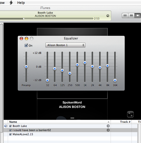 I Could Have Been a Banker was my first attempt at laying down vocals first. All three Soundcloud tracks were made that way. I have another Soundcloud acct – alisonboston where all the tracks were made with the intention of putting vocals over, but in the end I felt the tracks – with the exception of What the Fiesta – were complete without vocals. So for me as a poet – the text is my script, my delivery of the text is the ‘melody’, then all the other stuff is the ‘chords’ and arrangement! I suppose that’s one way of looking at it.Anyway, in the end I realised my Garageband is corrupted and I have an appt with the Genius Bar at Mac to sort it out. Will probably have to uninstall and reinstall. I think more RAM is also in order!Nonetheless, I tweaked it using the EQ settings you sent as a guide – tweaking both the vocal track and the master track. I also added a duplicate vocal track with very slight delay to fill out the sound a bit. Then did some digging around on the web and found a forum where exactly the volume problem was discussed. It recommended unticking ‘normalisation’ in Garage Band preferences as normalisation can apparently cause problems, then share as an AIFF file rather than MP3 – so that’s what I did.