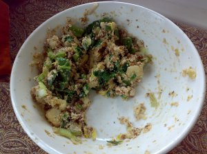 The tofu and hemp seed completely disappear, adding to the creamy texture and most people wouldn’t know they’re eating tofu, thinking instead that the potatoes had been well-cooked and mashed down a bit, making the dressing really thick. The chopped brazil nuts and golden linseed add some crunch.