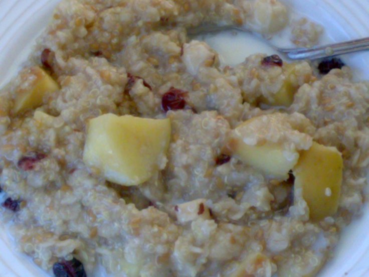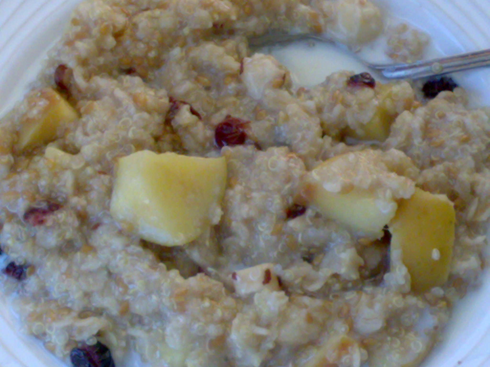 Put the quinoa to boil in about a cup of water. Add the chopped apple and ginger. Simmer for about 5 minutes then add the rolled oats, nuts and cranberries. Simmer until it takes on a runny, gluey consistency, stirring frequently to prevent sticking, then add the seeds and stir it all together.