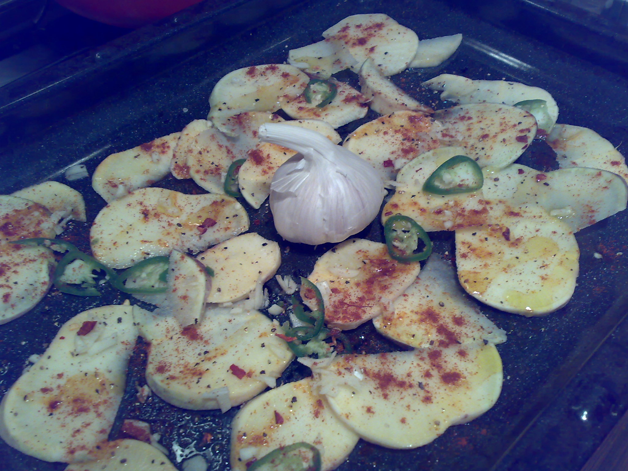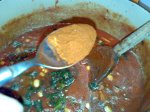 Thinly slice enough chard to cover the bottom of your roasting pan. Drizzle with olive oil, sprinkle with slivered garlic, slivered hot green chilies, and sweet red paprika, a little freshly ground sea salt and black pepper. Roast in a hot oven, turning once or twice. What you’re aiming for is a kind of crouton, or chip to sprinkle in the soup and/or dip in the roasted garlic.