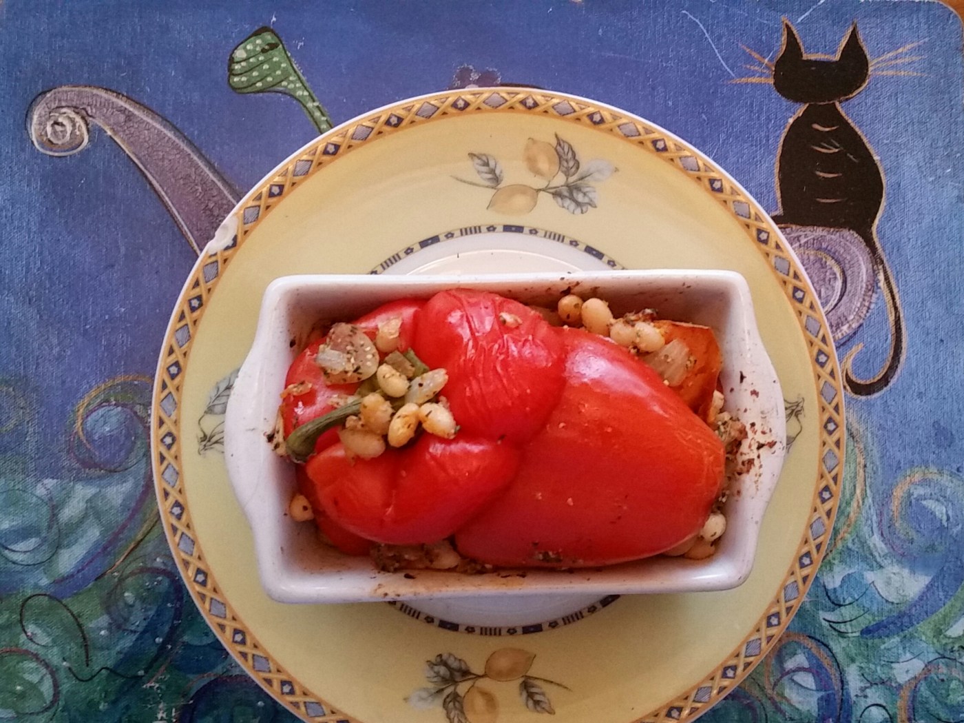 Bake a medium sized yam, and along with that a sweet red pepper, stuffed with: