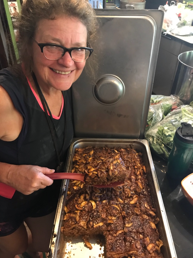 This latest was baked at the weekly Food Not Bombs kitchen, so large quantity. A 1/4 of the recipe would do a standard loaf pan.