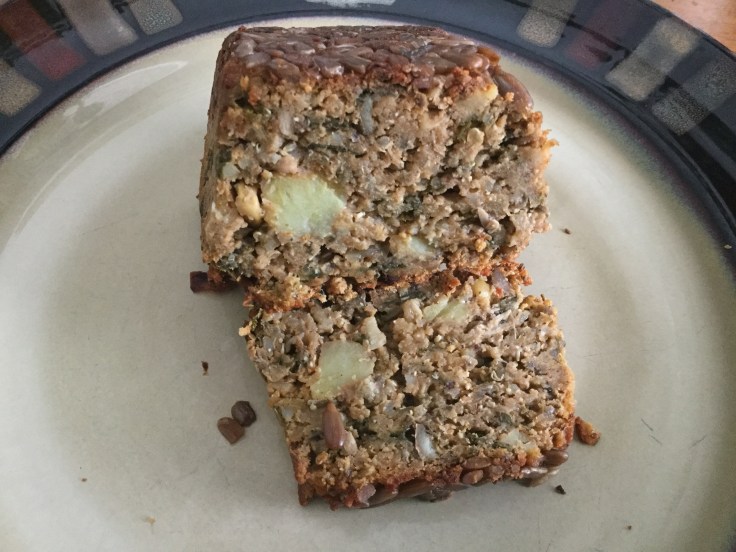 How to make it stick together without using lots of eggs? Cooked steel-cut oats are like glue; that works! They also offer amino acids that lysine-rich lentils lack, making them a good complement to build a complete protein. Add a few chia seeds to absorb excess moisture – along with hemp and sunflower seeds – all bringing more complementary amino acids, and this lentil loaf starts to have some chew, and delivers a good amount of protein! Throw in a little quinoa – a complete protein by itself – to add some texture, a few bread crumbs to build some body – and slices of this loaf might even stand-up!