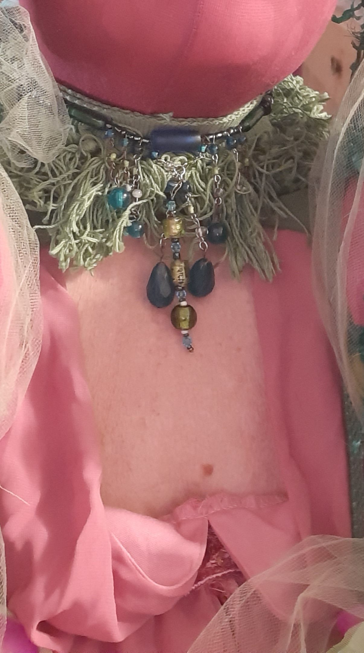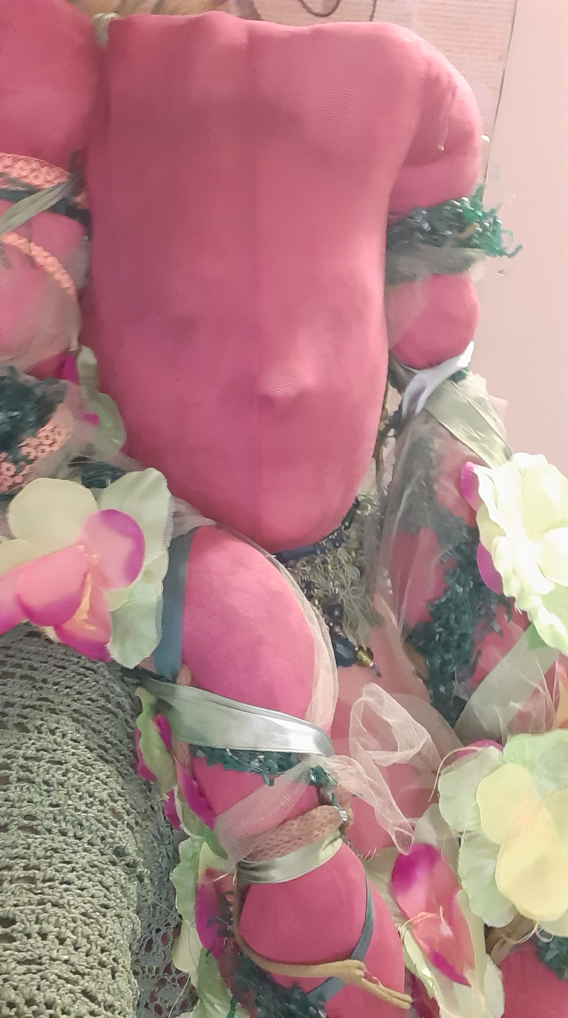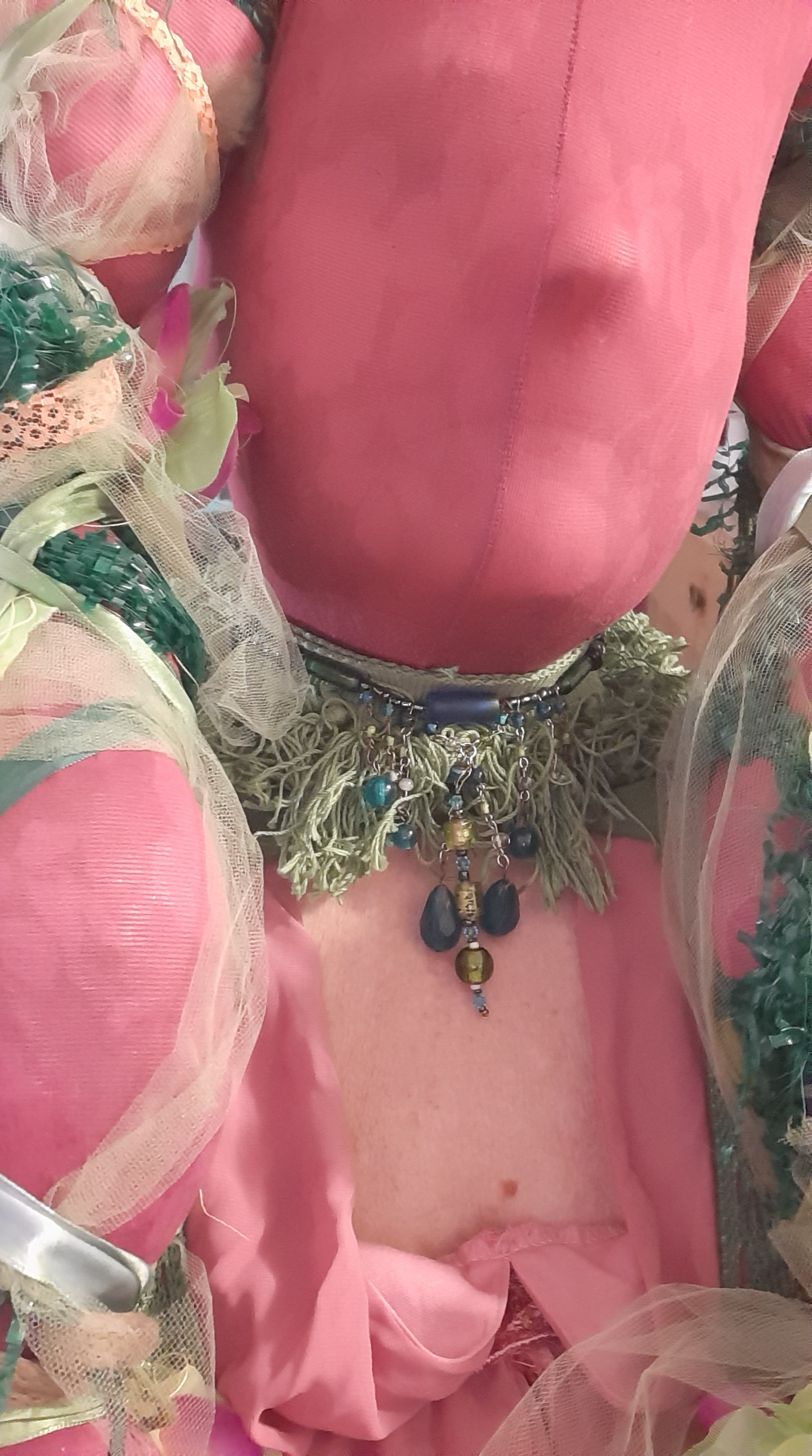 BegonY’as is a masked, costumed, spoken word, participatory performance. The costume – handmade, covered in fabric blooms – is itself a transformation: old pantyhose, and a ruffled top dyed pink, a white lace jacket dyed green, repurposed flowers from a Hawaiian lei stitched petal by petal onto an old green, ruffled skirt – making me a begonia.